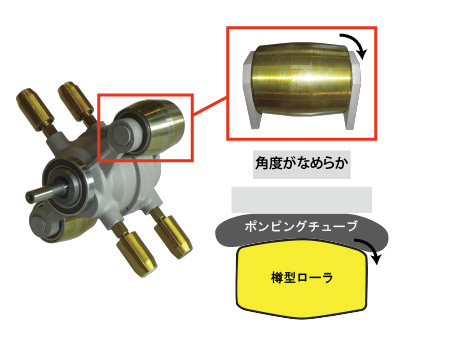 樽型のローラを採用しており、チューブがつぶれた際に両端の角度がなめらかなため、チューブにかかる圧力の逃げ道があります。