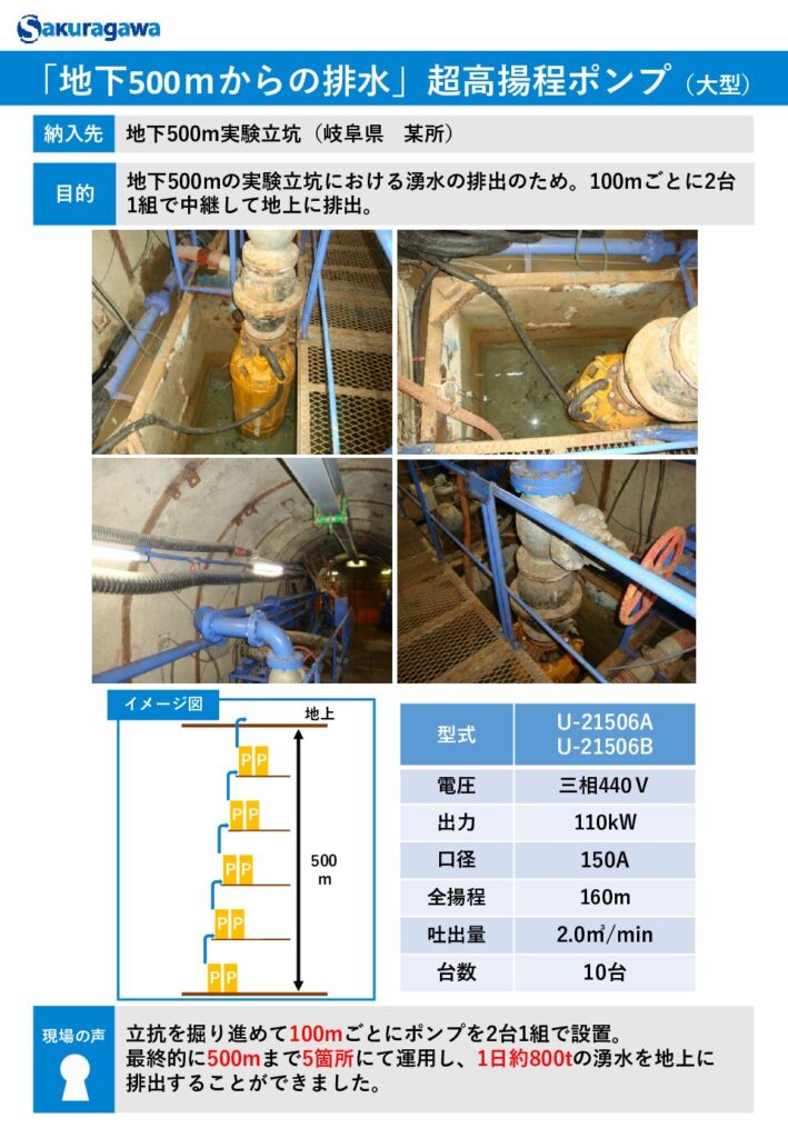 地下500mの立坑で湧水排水のために使用されました。 100mごとに2台1組でポンプを設置。 1日約800tの湧水を地上に排水することができました。
