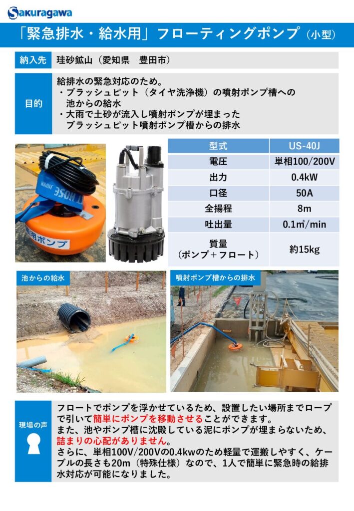 100Vポンプにフロートをつけて浮かべることで 底の沈殿物にポンプが埋まることなく、詰まる心配がありません。 またポンプを浮かべるため設置の手間が無く、緊急時もすぐに使用できます。